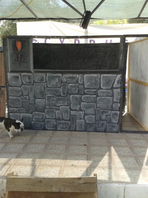 A frontispiece heads the front of stage, with 2 pillars of canvas each side of stage and like the 3 musketeers a top cross piece, other stage peices were developed in future meetings.