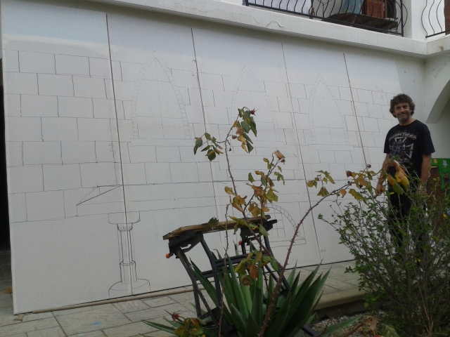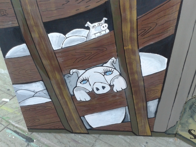 Luckily there was planty of room at Geminis House for the construction of the sets...so I got to work, drawing ideas & then painting large scale set pieces for what felt like for me, the first time in a very long time...