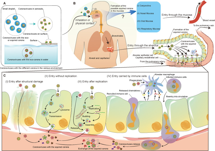 The family of coronavirus are named for their crown shape. Encoded by the genetic material inherited from the coronavirus itself, this intrinsic well-known “viral corona” is considered an “inherited corona”. After contact with mucosa or the entrance into the host, bare coronaviruses can become covered by a group of dissolved biomolecules to form one or multiple layers of biomolecules. The layers acquired from the surrounding environment are named the “acquired corona”. We highlight here the possible role of the acquired corona in the pathogenesis of coronaviruses, which will generate fresh insight into the nature of various coronavirus-host interactions.