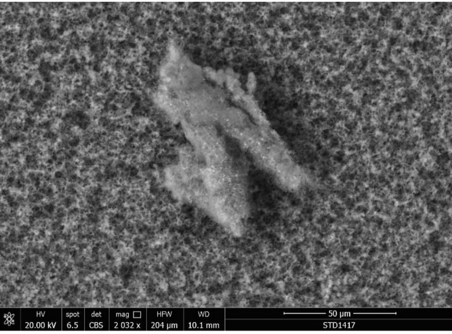 Figures 15 and 16 below show a micrograph of different micro and nano particulates which have been identified and analyzed under an Environmental Scanning Electron Microscope (SEM) coupled with an x-ray microprobe of an Energy Dispersive System (EDS) that reveals the chemical nature of the observed micro and nano particulates and their morphology.
