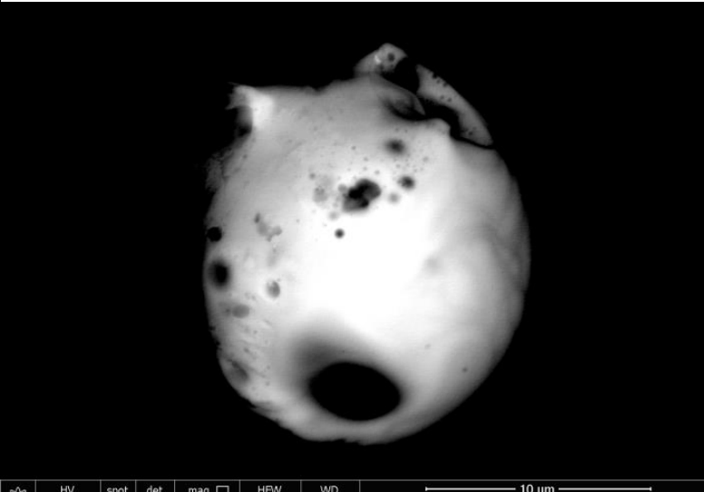 Figures 27 and 28 shows an analysis which was also performed under Transmission Electron Microscopy (TEM) and quantified with an x-ray microprobe of an Energy Dispersive System (EDS) and revealed the chemical nature of the observed micro and nano particulates. Many foreign bodies were identified with a spherical morphology with some bubble-shaped cavities.