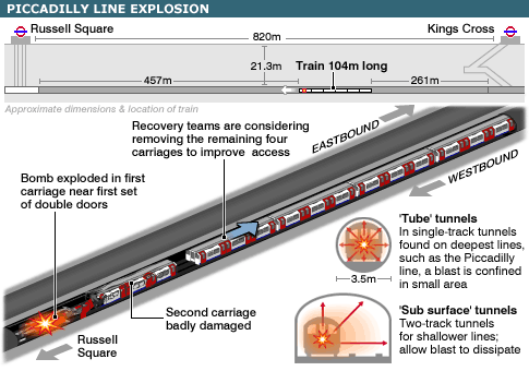 A THIRD bomb detonates on the first carriage of a train travelling between Russell Square and King's Cross stations, north London, on the Piccadilly Line, the deepest of the three attacks. Twenty-one people are confirmed dead but police and firemen are still trying to recover bodies from the wreckage.