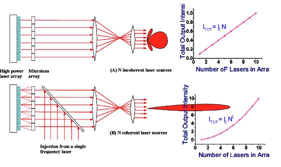 We seek to design a laser array source that will be capable to significantly increase the energy deposited per unit area on a target together with a decrease in the power consumption of the laser array. By combining lasers into N-laser array it is possible to reduce the beam divergence N times (N is the number of lasers in the array). Thus, much better focusing and concentration of the emitted power are achieved. In addition, by manipulating the phases of each laser, the beam shape as well as the intensity strength and profile can be controlled.