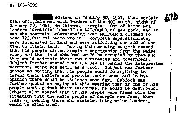 In early 1961 NOI and the KKK had a meeting in Atlanta, Georgia in the US. Both Elijah Muhammad and Malcolm X a NOI leader met KKK dignitaries. The two groups came to the joint opinion that parts of South Carolina and Georgia in the United States should become a black homeland with KKK holding state power. (Searchlight December 1997).